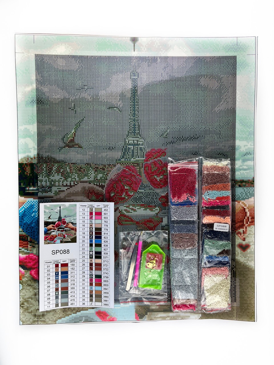 -Вийміть набір із коробки. Звільніть невеликий кусочок схеми від захисного паперу. Рекомендуємо відклеїти стільки, скільки ви зможете зробити за один раз.