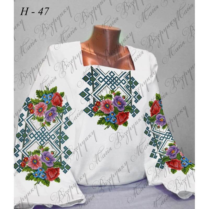 Заготовка складається з двох полотен 75*75см на передню частину і на спинку (без вишивки) та двох полотен 75*65 см на рукави. В комплект входить інструкція в якій вказано кольори бісеру і його кількість, рекомендовані номери ниток DMC. Дану заготовку ви можете скроїти за своїми розмірами та фасоном.