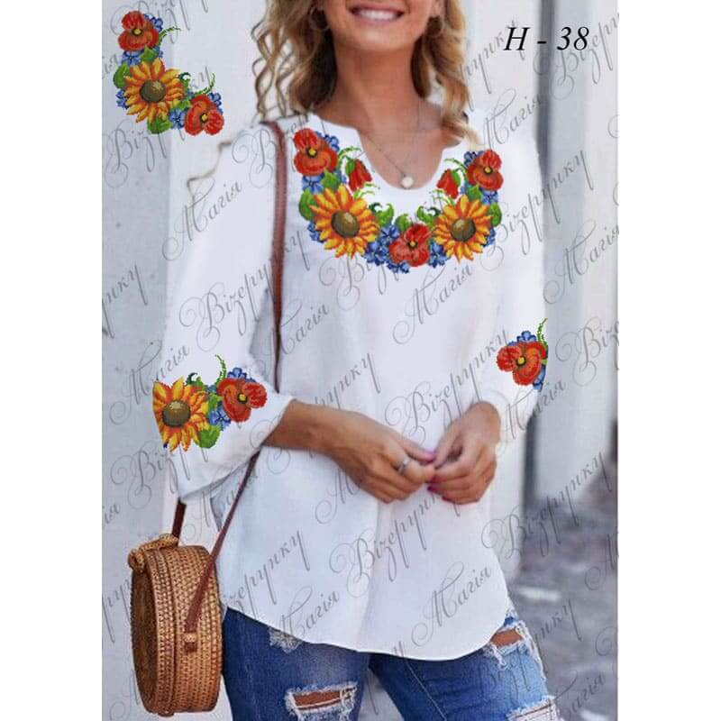 Заготовка складається з двох полотен 75*75см на передню частину і на спинку (без вишивки) та двох полотен 75*65 см на рукави. В комплект входить інструкція в якій вказано кольори бісеру і його кількість, рекомендовані номери ниток DMC. Дану заготовку ви можете скроїти за своїми розмірами та фасоном.