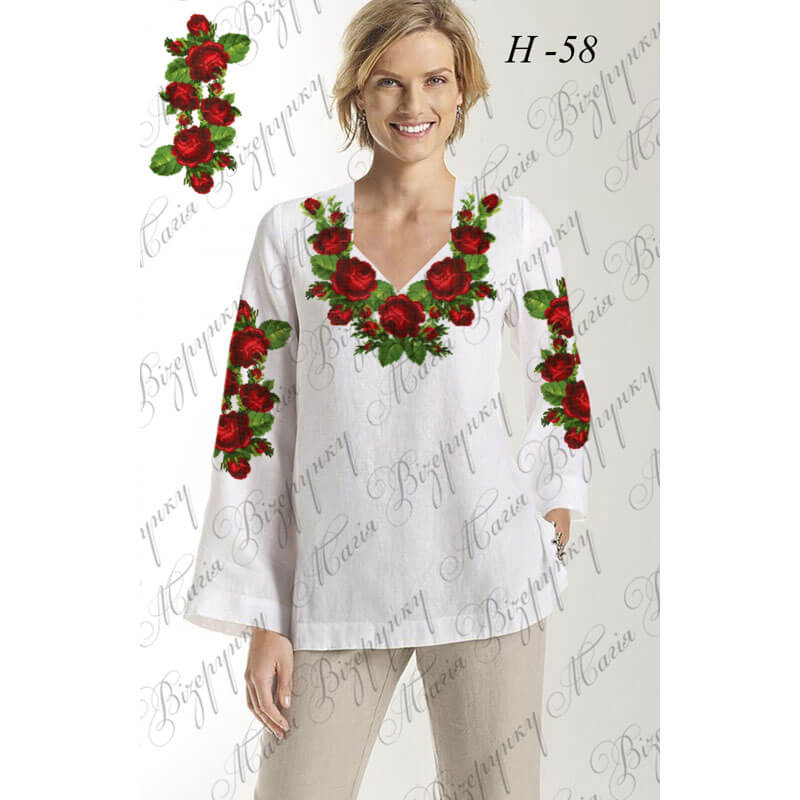 Заготовка складається з двох полотен 75*75см на передню частину і на спинку (без вишивки) та двох полотен 75*65 см на рукави. В комплект входить інструкція в якій вказано кольори бісеру і його кількість, рекомендовані номери ниток DMC. Дану заготовку ви можете скроїти за своїми розмірами та фасоном.