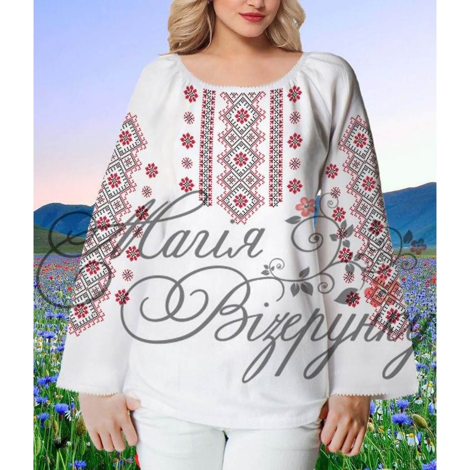 Заготовка складається з двох полотен 75*75 см на передню частину і на спинку (без вишивки) та двох полотен 75*65 см на рукави. В комплект входить інструкція в якій вказано кольори бісеру і його кількість, рекомендовані номери ниток DMC. Дану заготовку ви можете скроїти за своїми розмірами та фасоном.
