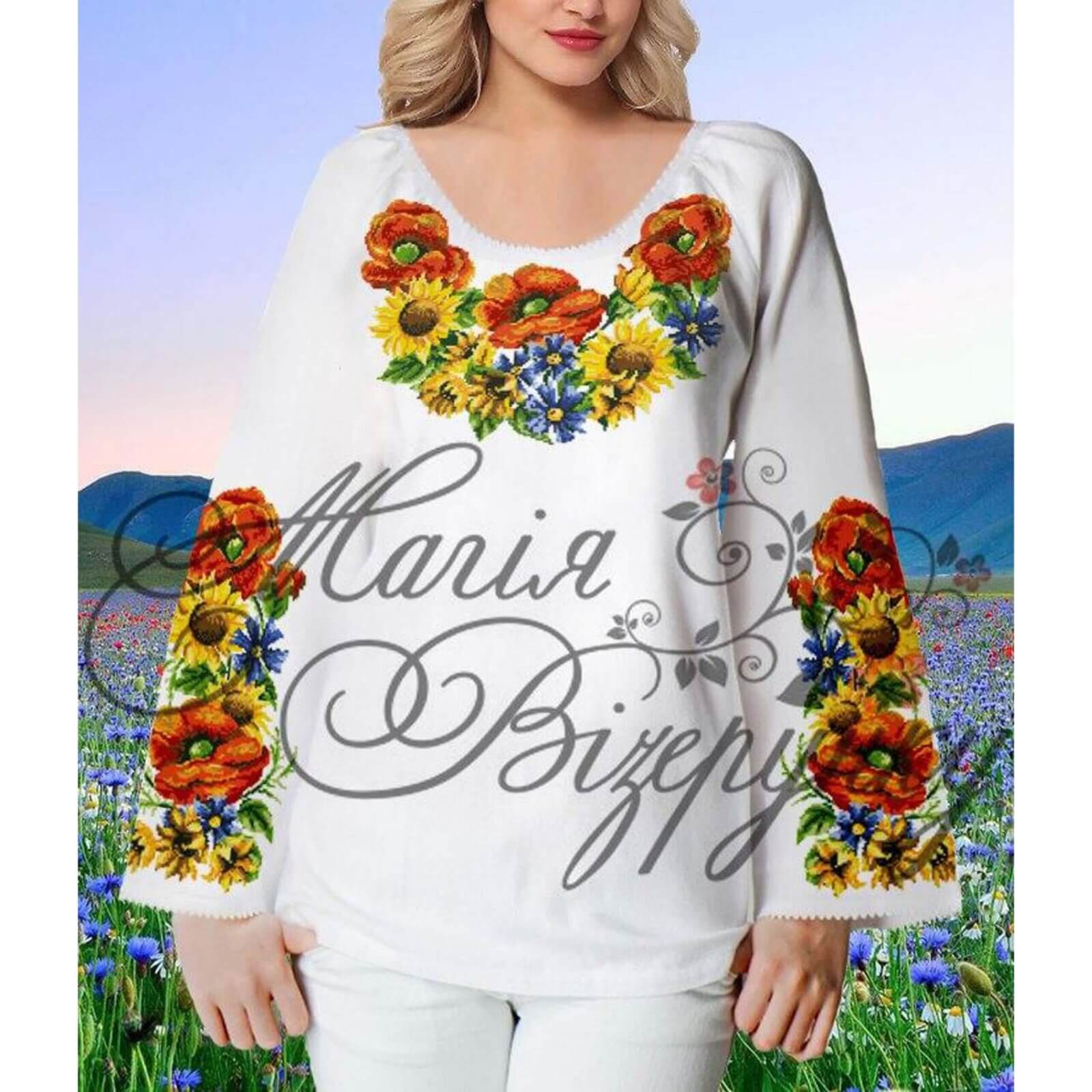 Заготовка складається з двох полотен 75*75 см на передню частину і на спинку (без вишивки) та двох полотен 75*65 см на рукави. В комплект входить інструкція в якій вказано кольори бісеру і його кількість, рекомендовані номери ниток DMC. Дану заготовку ви можете скроїти за своїми розмірами та фасоном.