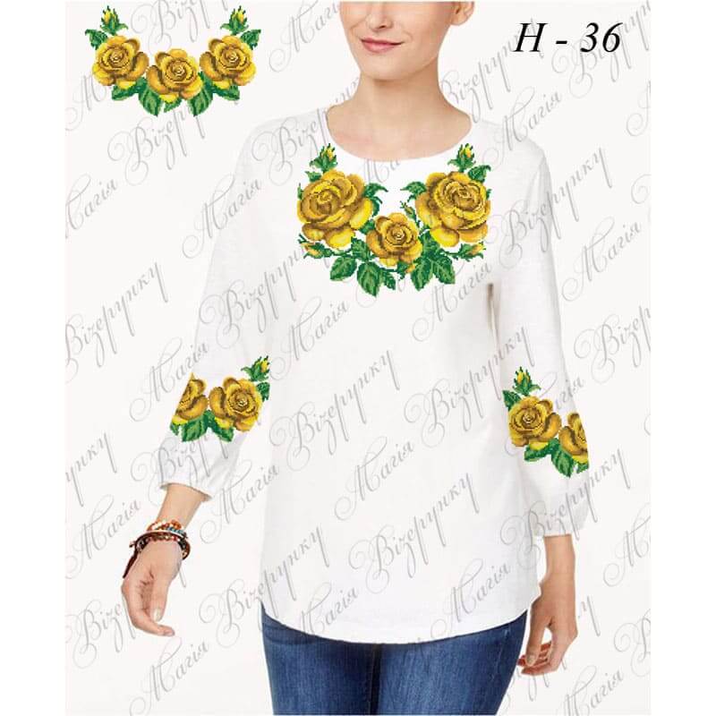 Заготовка складається з двох полотен 75*75см на передню частину і на спинку (без вишивки) та двох полотен 75*65 см на рукави. В комплект входить інструкція в якій вказано кольори бісеру і його кількість, рекомендовані номери ниток DMC. Дану заготовку ви можете скроїти за своїми розмірами та фасоном.